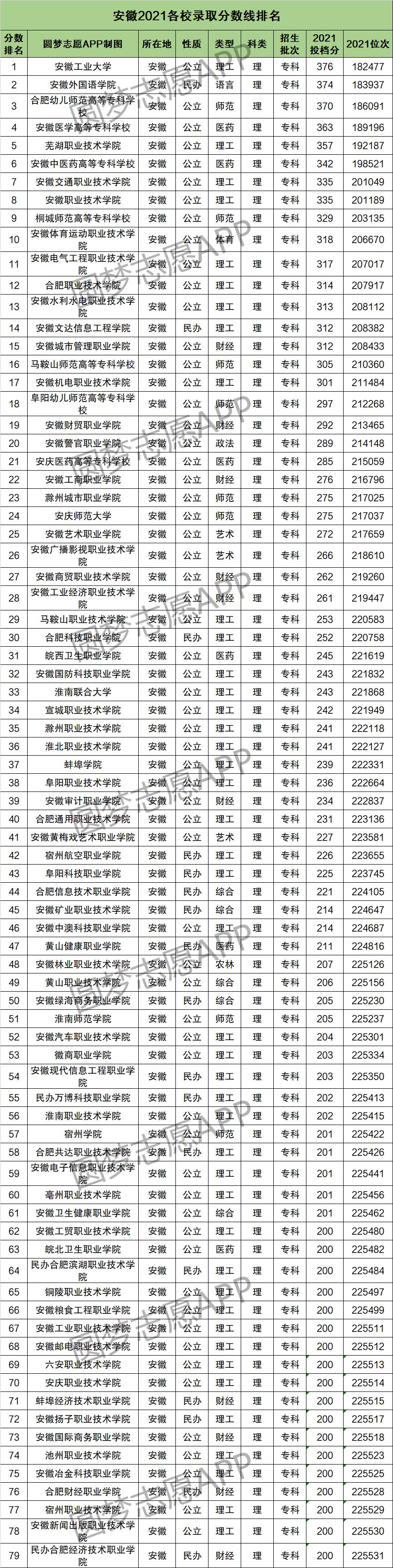 3、安徽2021各校录取分数线排名(专科理工类)
