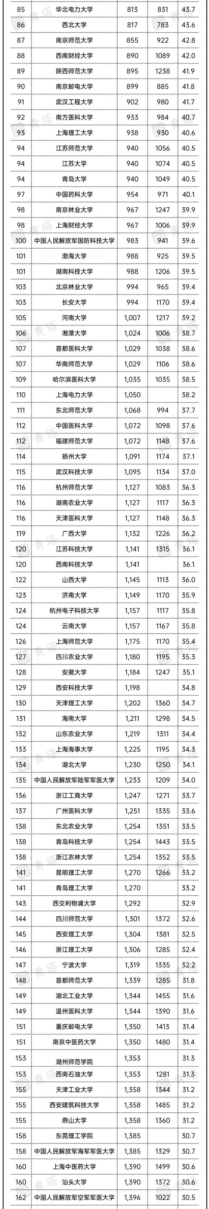 以下为中国内地高校排名情况: