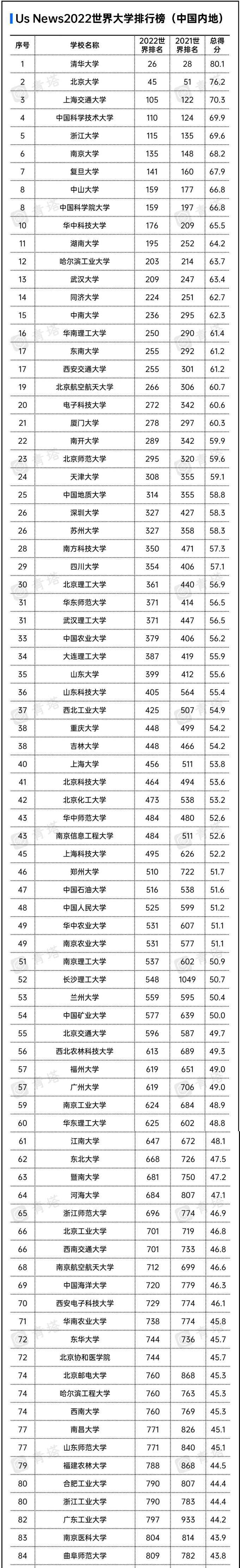 大家也许还注意到了,就是相较2021年的我国的US News世界大学,我国的大学基本都是保持不同程度的进步,几乎看不到排名退步的学校。这说明我国的高等教育事业也在随着国家综合国力的提高逐渐接近世界一流的水平!希望以后在百强榜里可以看到更多的我国的优秀大学。