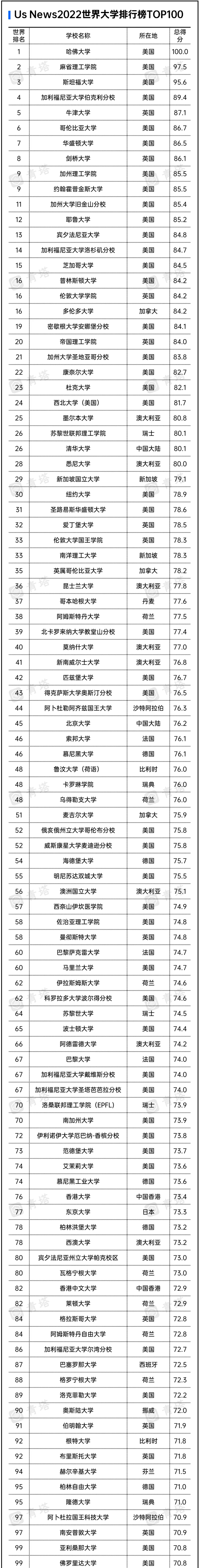 US News2022世界大学排行榜TOP100高校详细名单如下: