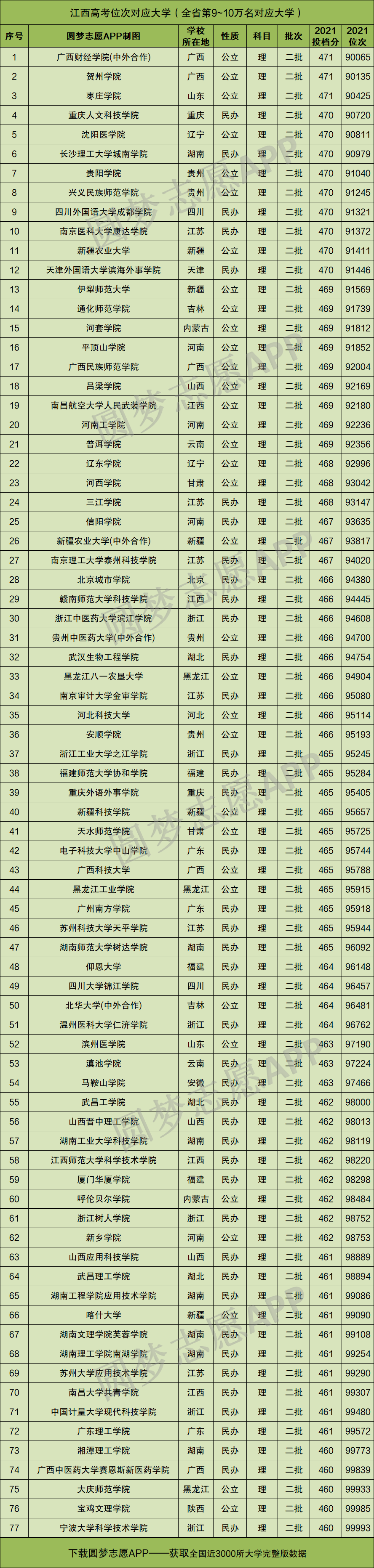 根据上图可知,2021年江西高考理科本科第9万名至10万名对应的大学有77所。而在这个名次范围内收分最低的十所大学分别是: