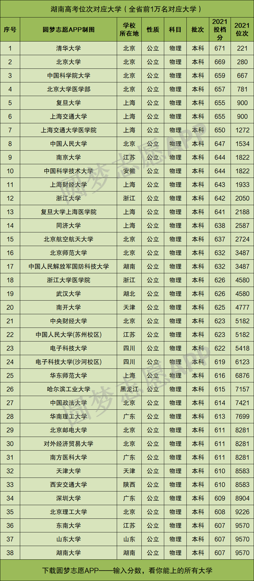 一、湖南高考排名对应学校(全省物理类前1万名对应大学名单)