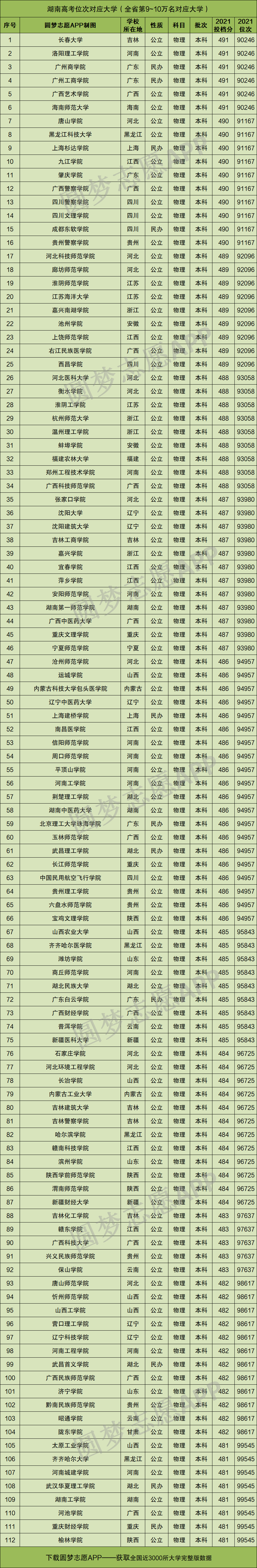 根据上图可知,2021年湖南高考物理类第9万名至10万名对应的大学有112所。而在这个名次范围内收分最低的十所大学分别是: