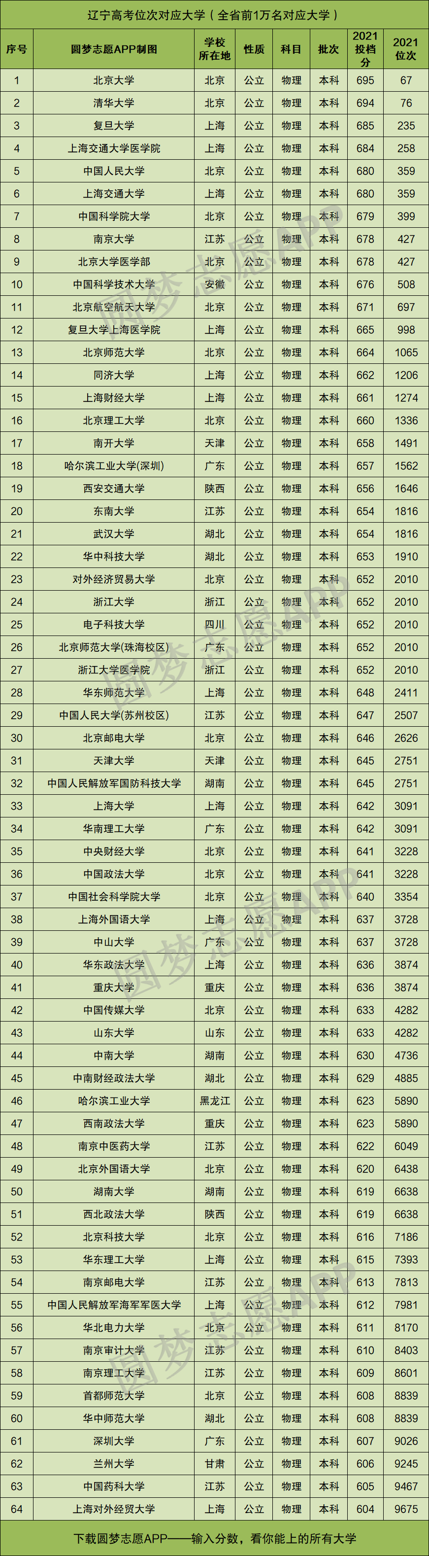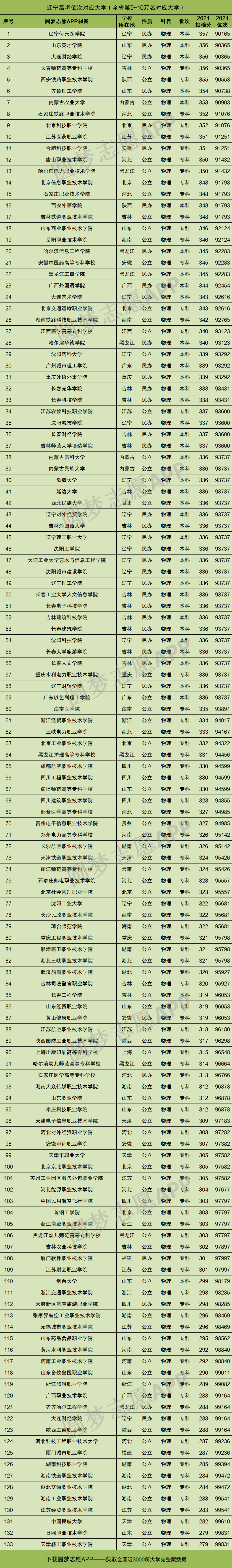重要提示:由于本文篇幅有限,仅展示辽宁物理类高考位次在前1万名、以及9万~10万名分别对应的大学名单和分数线,如果你想查看全国所有大学的录取位次及分数,请直接在中Excel表格查阅!