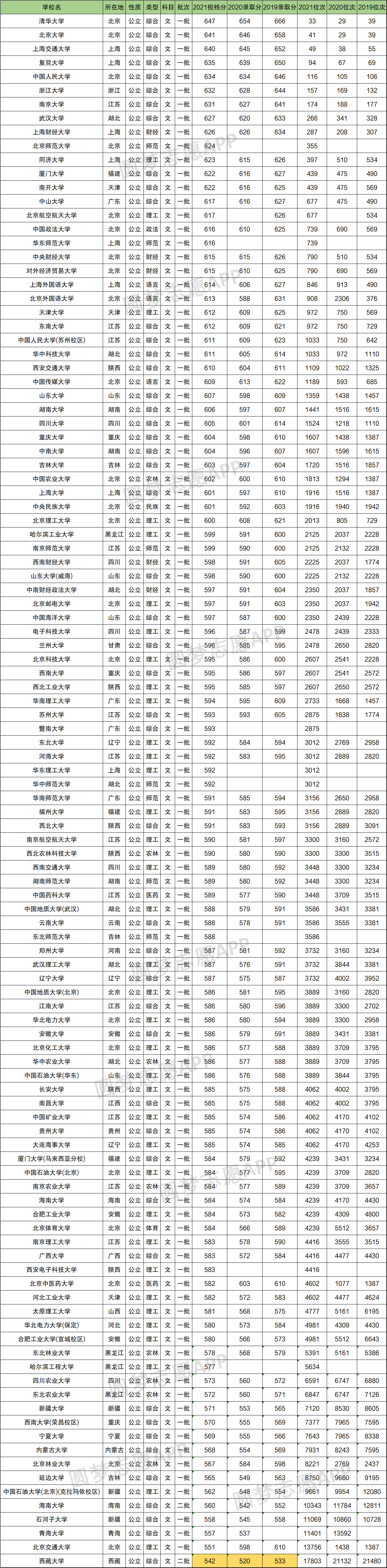 2021年文科投档分最高的当属清华大学,为647分,最低投档位次33位;投档分最低的是西藏大学,为542分,最低投档位次为17803位。