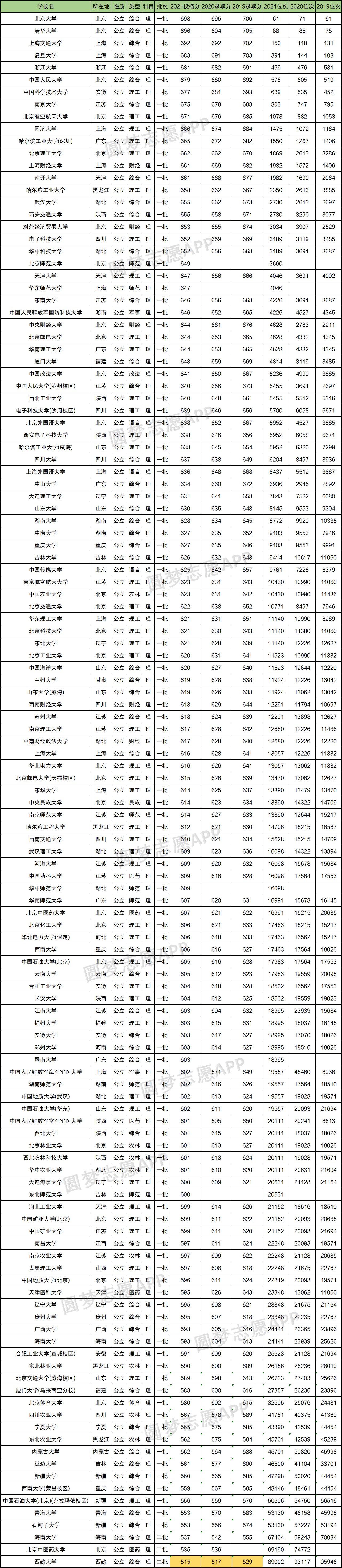 从下表可以得知,2021年理科投档分最高的是北京大学,为698分,位次投档位次为61位;投档分最低的是西藏大学,为515分,最低投档位次为89002位。