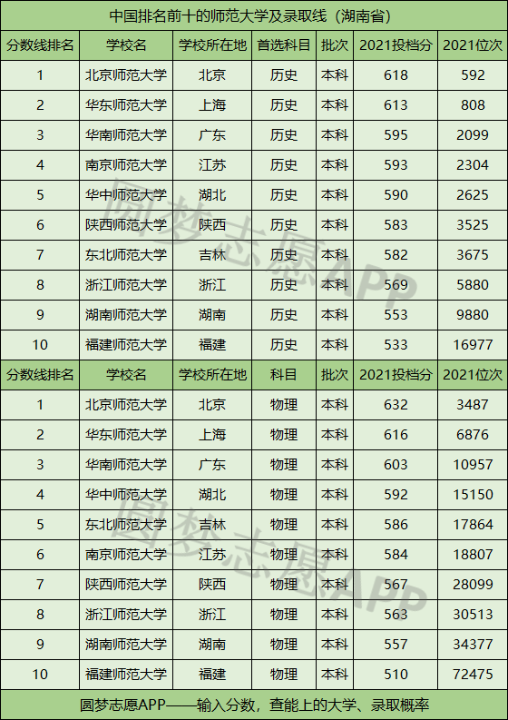 全国排名前十的师范类大学中,在湖南省录取分数线最低的:是福建师范大学,2021年在首选历史科目投档分为533分,最低位次为16977名;在首选物理科目投档分为510分,最低位次为72475名。