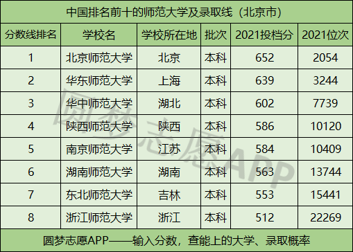 全国排名前十的师范类大学中:在北京录取分数线最低的是浙江师范大学,2021年投档分为512分,最低位次为22269名。