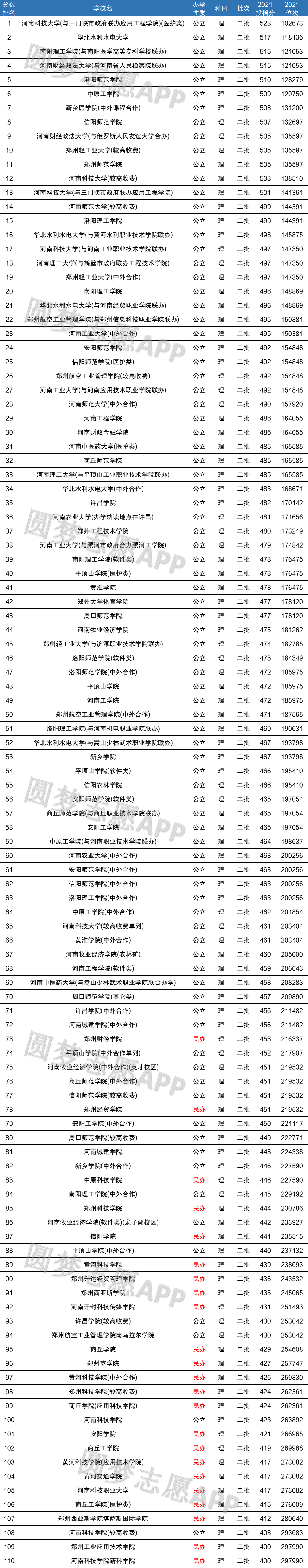 从理科收分中我们得知,公办院校收分最低的二本大学为河南科技学院(较高收费),最低的分数为403分;民办院校收分最低的二本大学为河南科技学院新科学院,最低分数为400分。