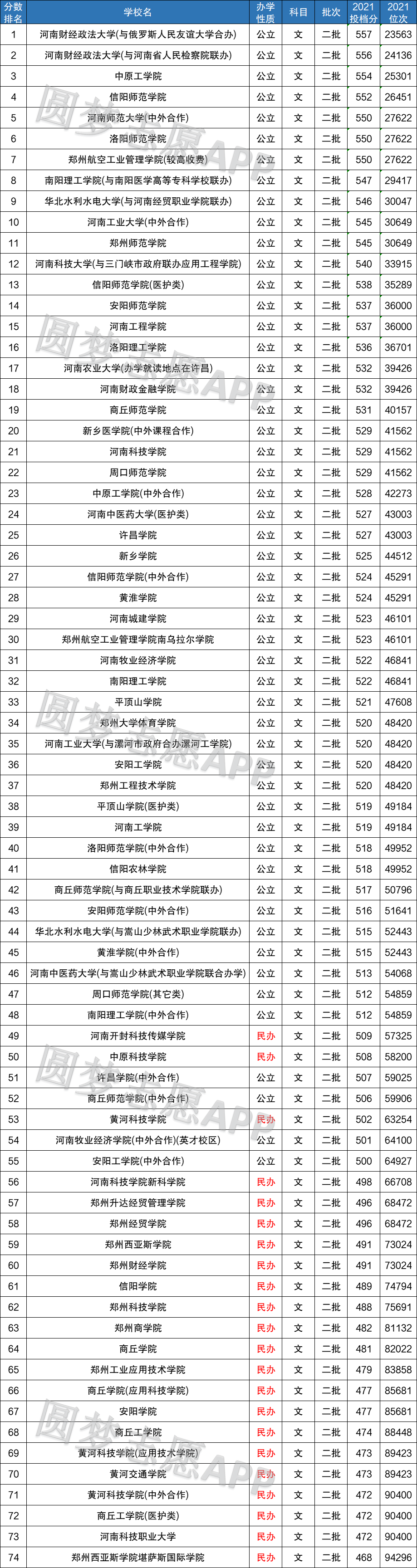 从文科收分中我们得知,公办院校收分最低的二本大学为安阳工学院(中外合作),最低的分数为500分;民办院校收分最低的二本大学为郑州西亚斯学院堪萨斯国际学院,最低分数为468分。