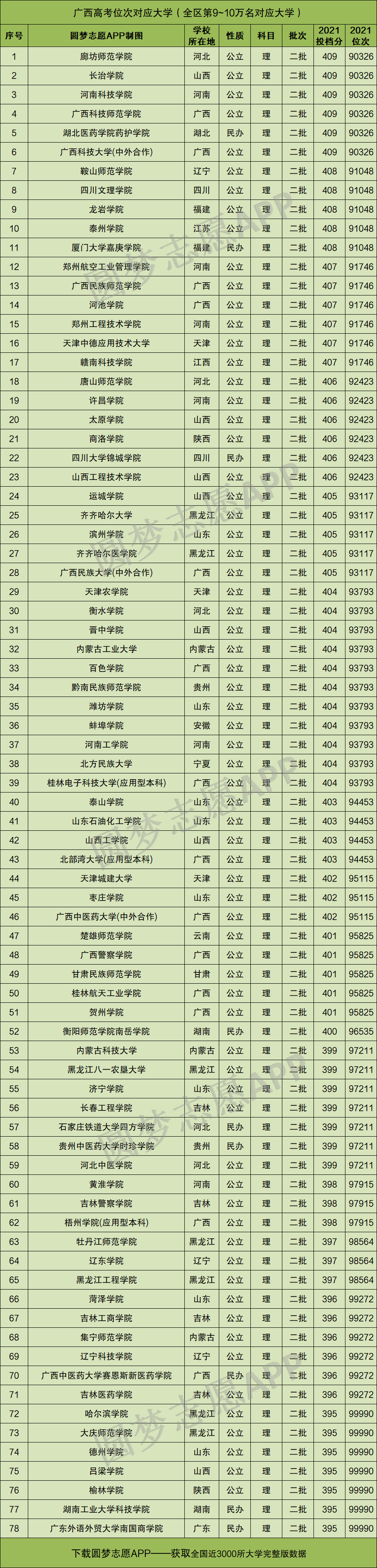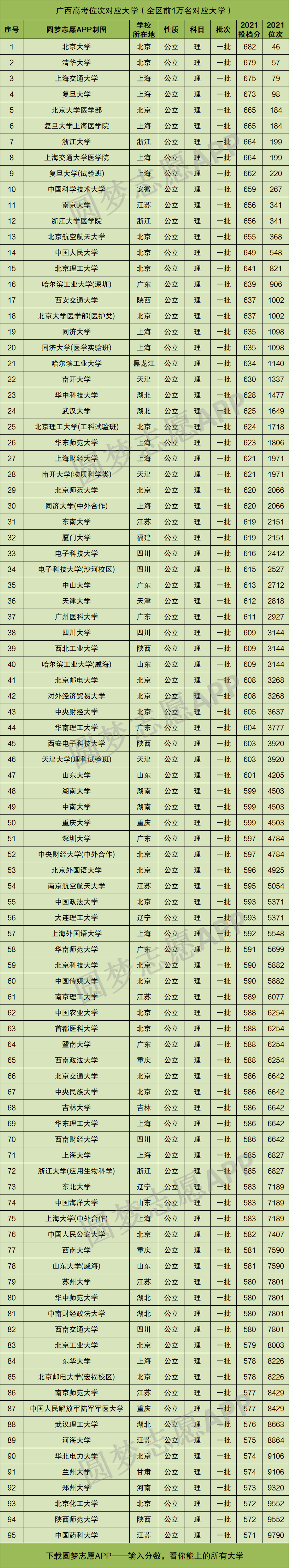 重要提示:由于本文篇幅有限,仅展示广西理科高考位次在前1万名、以及9万~10万名分别对应的大学名单和分数线,如果你想查看全国所有大学的录取位次及分数,请直接在中Excel表格查阅!