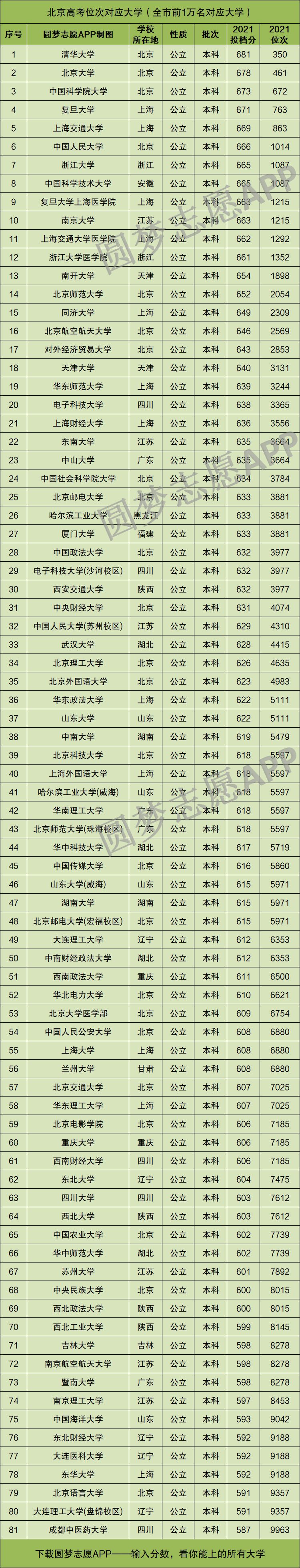 重要提示:由于本文篇幅有限,仅展示北京高考位次在前1万名对应的大学名单和分数线,如果你想查看全国所有大学的录取位次及分数,请直接在中Excel表格查阅!