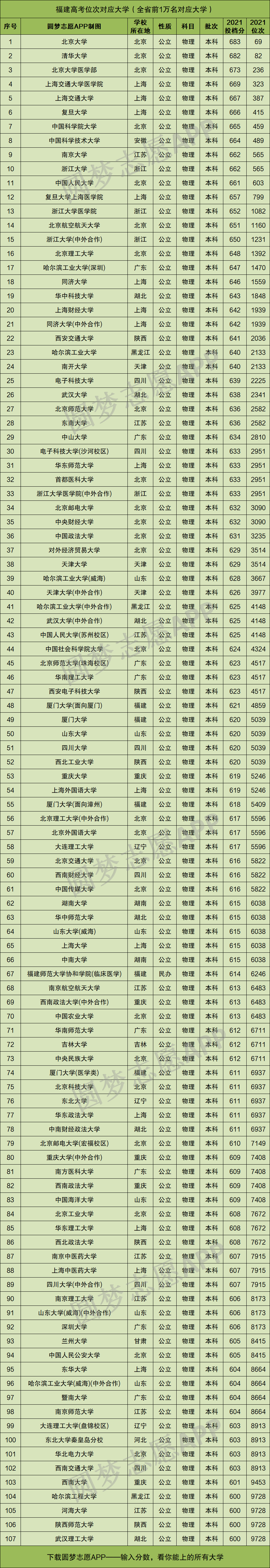重要提示:由于本文篇幅有限,仅展示福建物理类高考位次在前1万名对应的大学名单和分数线,如果你想查看全国所有大学的录取位次及分数,请直接在中Excel表格查阅!