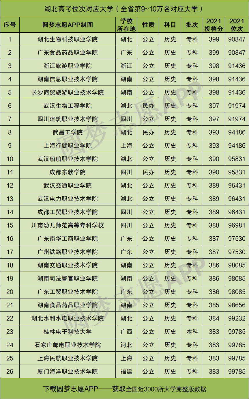 重要提示:由于本文篇幅有限,仅展示湖北历史类高考位次在前1万名、以及9万~10万名分别对应的大学名单和分数线,如果你想查看全国所有大学的录取位次及分数,请直接在中Excel表格查阅!
