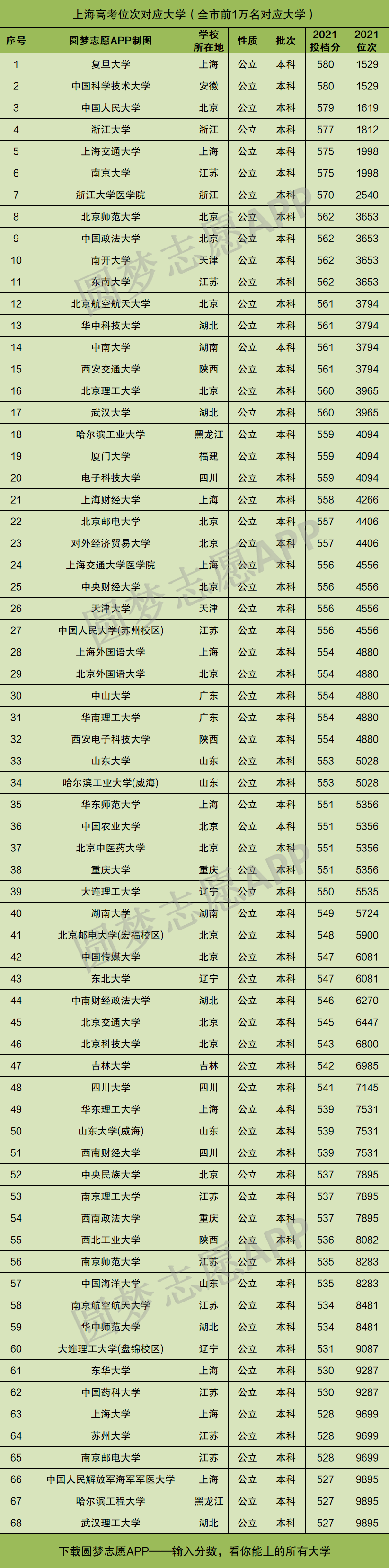 重要提示:由于本文篇幅有限,仅展示上海高考位次在前1万名对应的大学名单和分数线,如果你想查看全国所有大学的录取位次及分数,请直接在中Excel表格查阅!