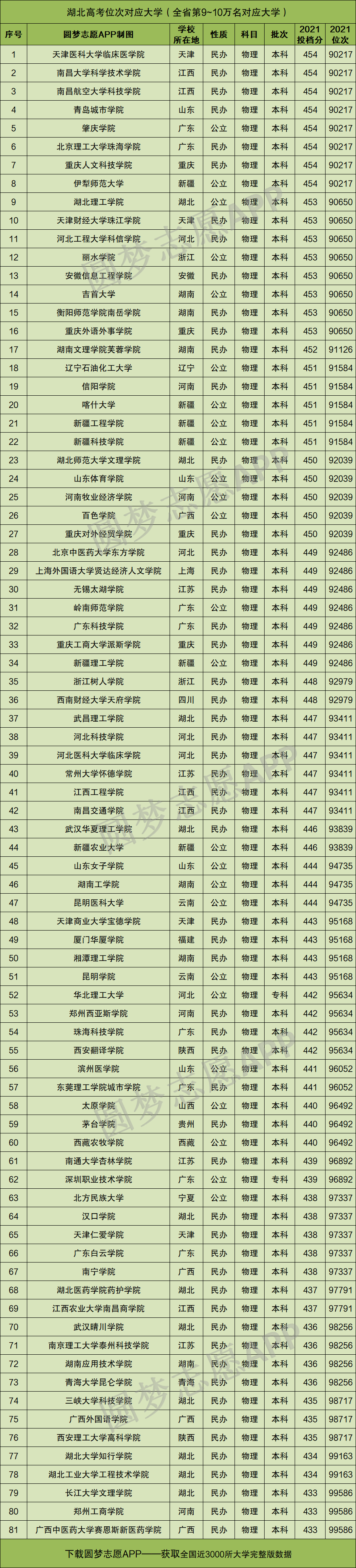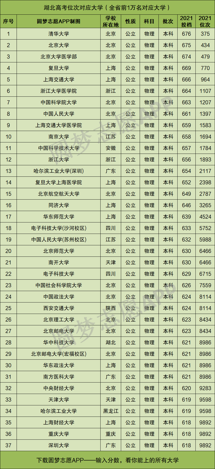 重要提示:由于本文篇幅有限,仅展示湖北物理类高考位次在前1万名、以及9万~10万名分别对应的大学名单和分数线,如果你想查看全国所有大学的录取位次及分数,请直接在中Excel表格查阅!