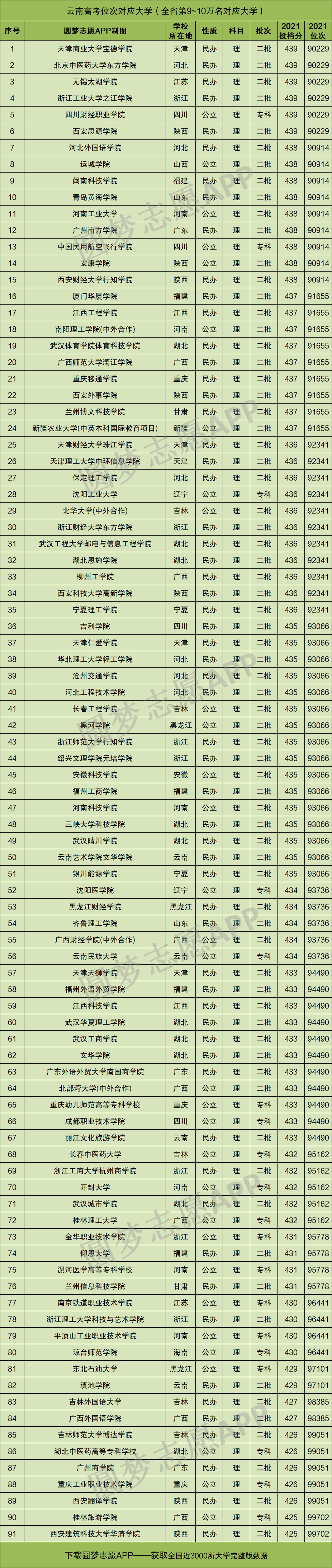 根据上图可知,2021年云南高考理科第9万名至10万名对应的大学有91所。而在这个名次范围内收分最低的十所大学分别是: