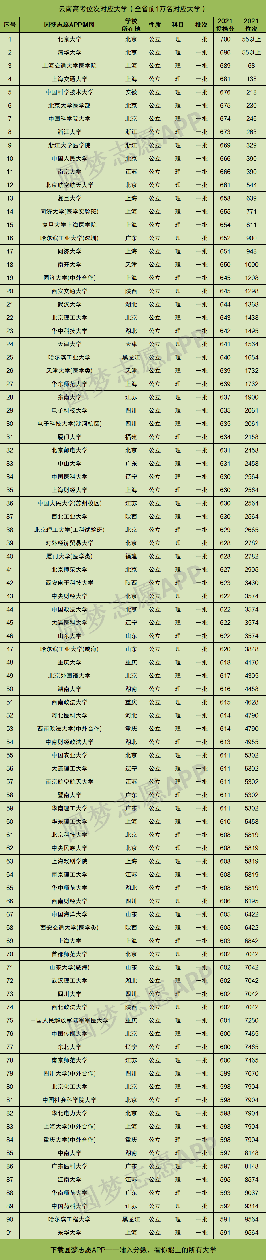 重要提示:由于本文篇幅有限,仅展示云南理科高考位次在前1万名、以及9万~10万名分别对应的大学名单和分数线,如果你想查看全国所有大学的录取位次及分数,请直接在中Excel表格查阅!