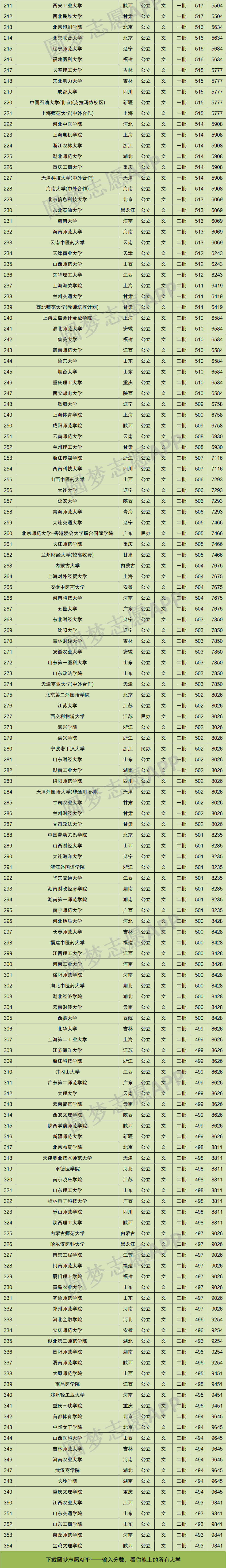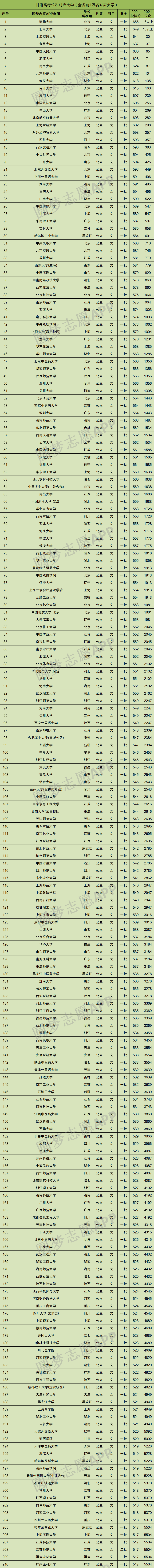 重要提示:由于本文篇幅有限,仅展示甘肃文科高考位次在前1万名对应的大学名单和分数线,如果你想查看全国所有大学的录取位次及分数,请直接在中Excel表格查阅!