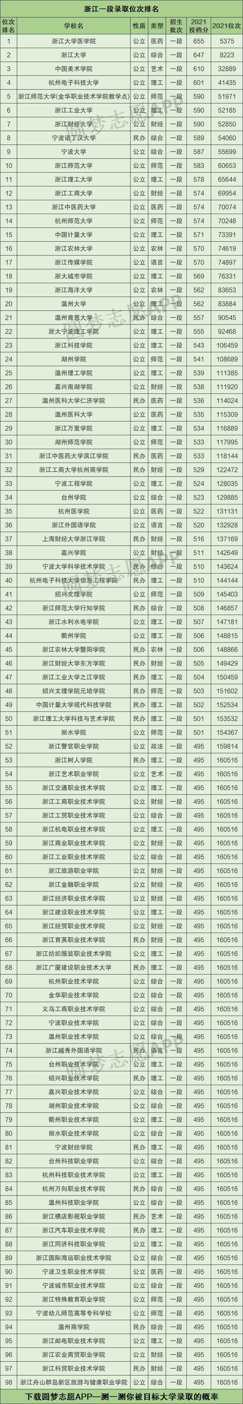 浙江省内的所有在一段招生的大学2021年在浙江录取位次排名及分数线汇总