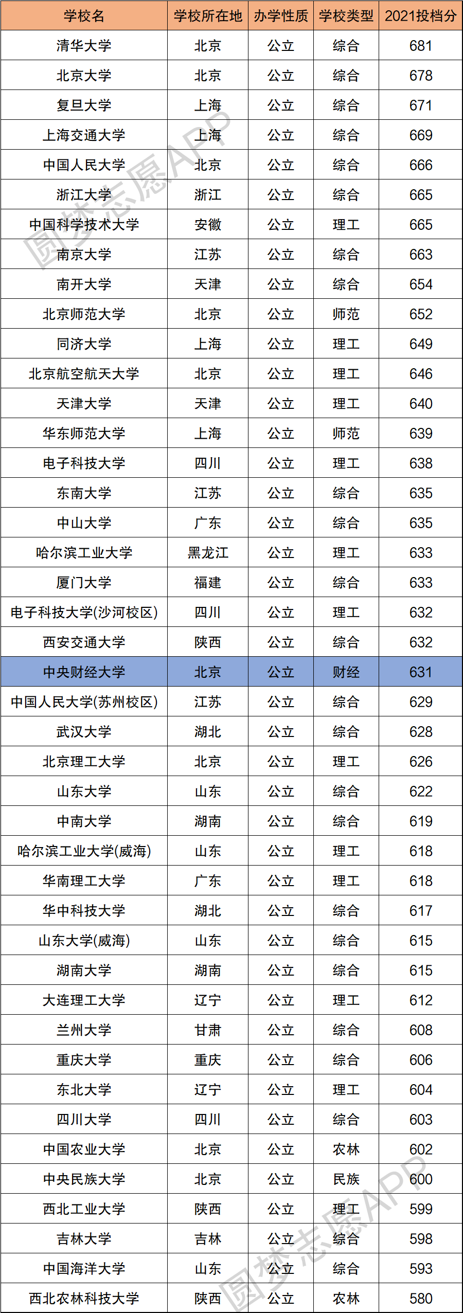 如果是从分数线的角度来看,中央财经大学确实比很多985大学还要厉害。老师整理了985大学及中央财经大学在北京市的投档线,同学们一看便知: