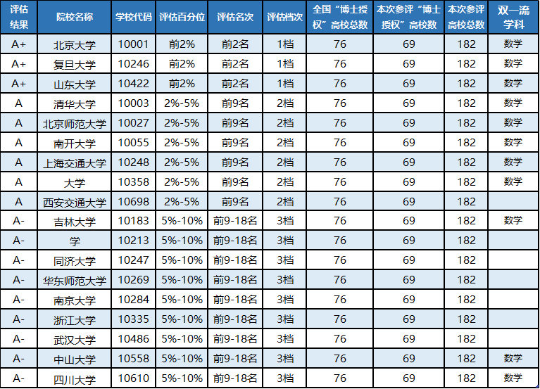 教育部文件提出,“强基计划”起步阶段,突出基础学科的支撑引领作用,结合高校办学特色,重点在数学、物理、化学、生物及历史、哲学、古文字学等基础学科专业安排招生。下面我们就看看 数学、物理、化学、生物、历史、哲学、古文字学这6个重点专业的最新学科评估结果(数据来源于教育部第四次全国高校学科评估公布的文件)