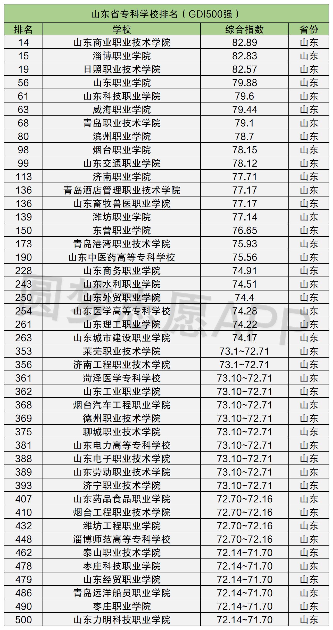 山东省的专科院校比较多,且排行榜单也比较多,因此这里小编只整理GDI高职排名500强以内的学校排名;如果大家还想查看其他学校的排名信息或者学校信息等内容可以圆并登录梦志愿APP即可查看;另外内也可以查看学校录取分数、专业录取分数、毕业生就业情况、师资力量等相关内容;APP在各大手机应用市场都可以。