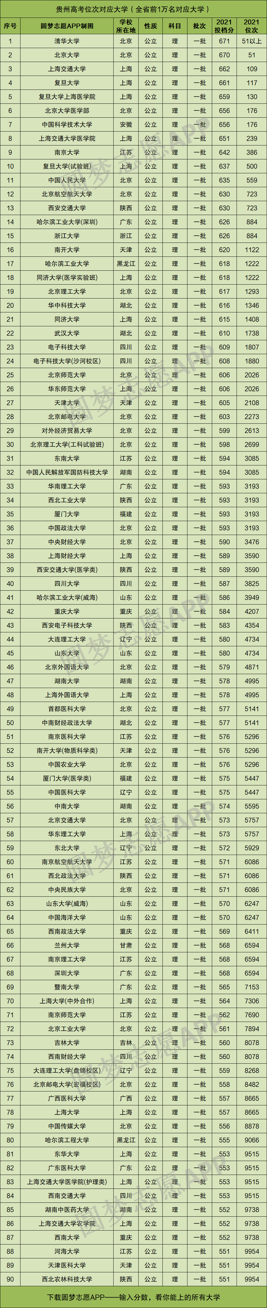 重要提示:由于本文篇幅有限,仅展示贵州理科高考位次在前1万名、以及9万~10万名分别对应的大学名单和分数线,如果你想查看全国所有大学的录取位次及分数,请直接在中Excel表格查阅!