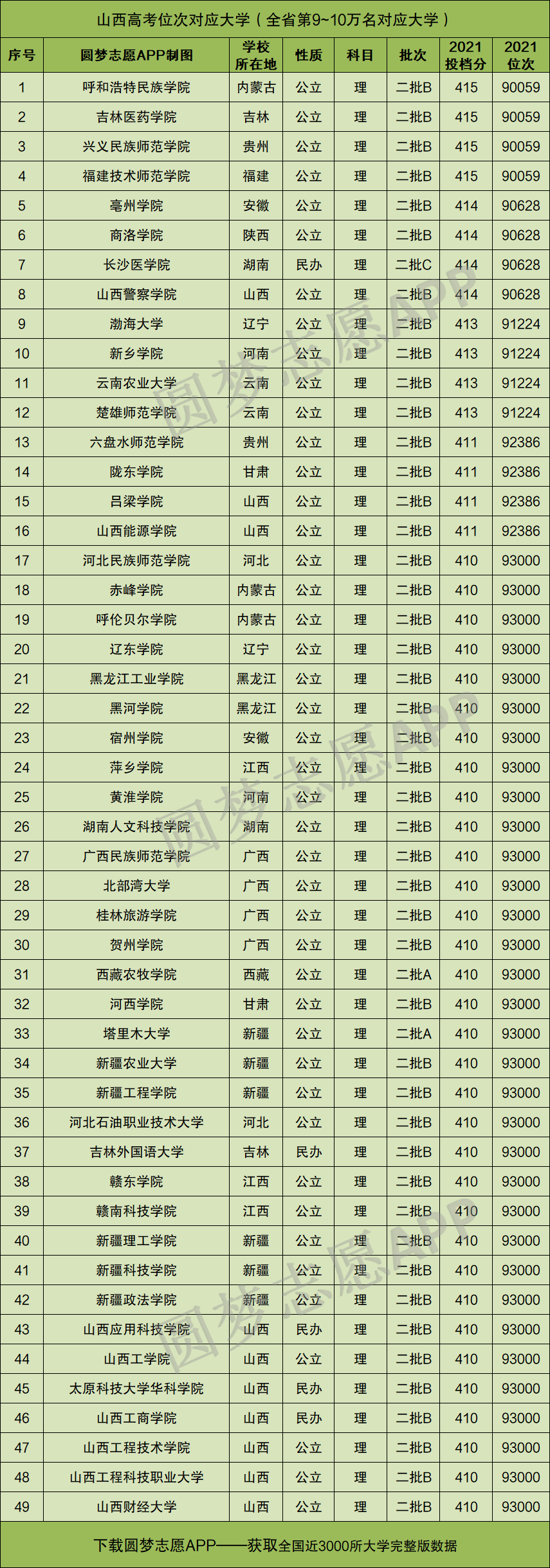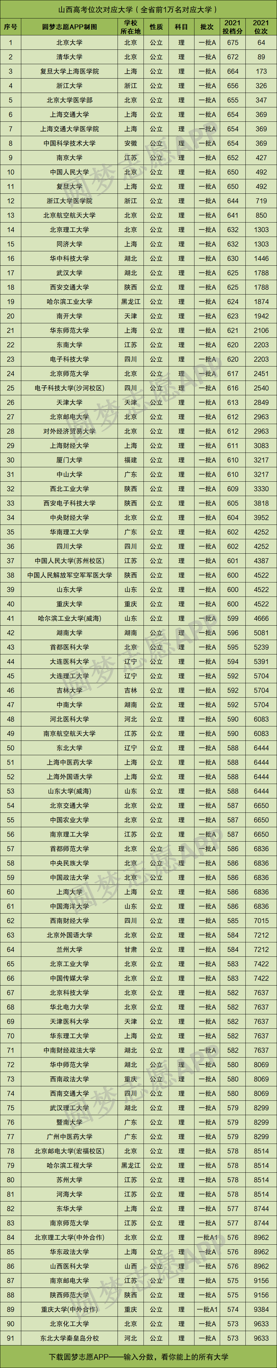 重要提示:由于本文篇幅有限,仅展示山西理科高考位次在前1万名、以及9万~10万名分别对应的大学名单和分数线,如果你想查看全国所有大学的录取位次及分数,请直接在中Excel表格查阅!