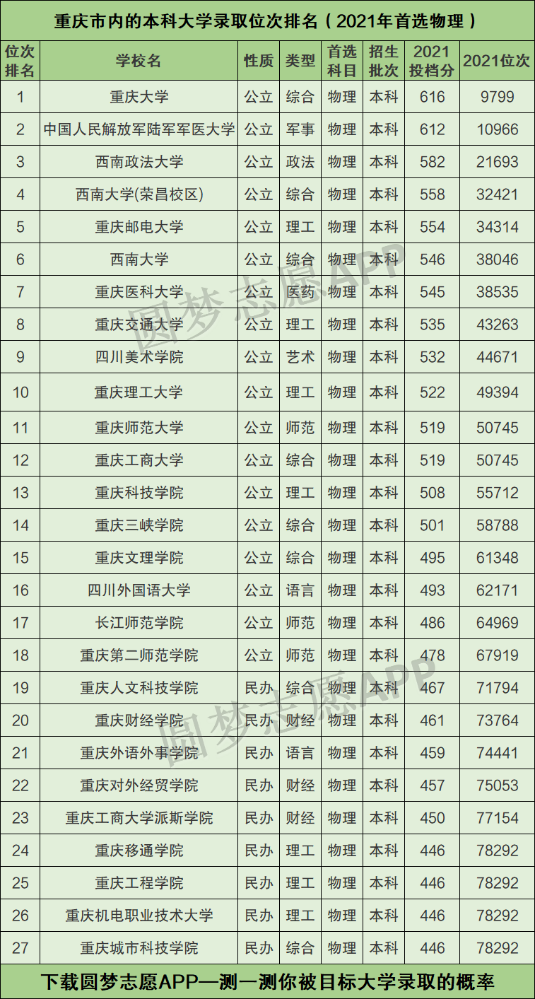 一、重庆市内的所有本科大学2021年在重庆录取位次排名及分数线汇总(物理类):
