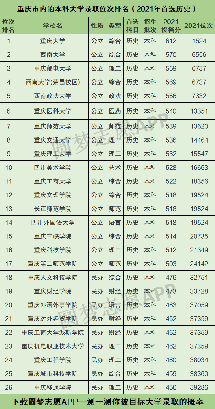 二、重庆市内的所有本科大学2021年在重庆录取位次排名及分数线汇总(历史类):