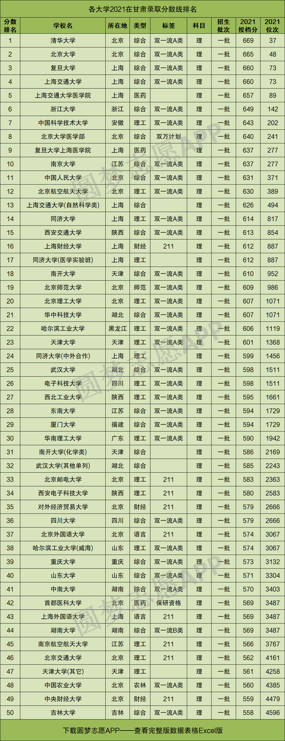 一、2021年高考各大学在甘肃录取分数线排名