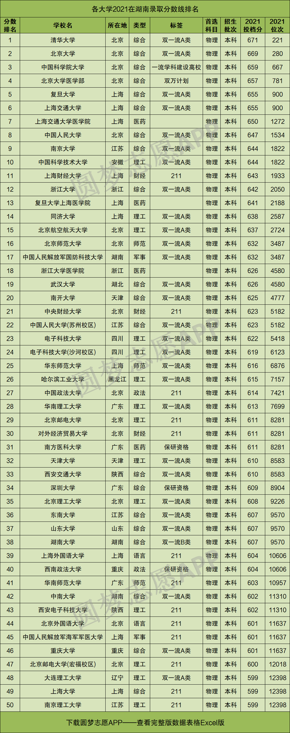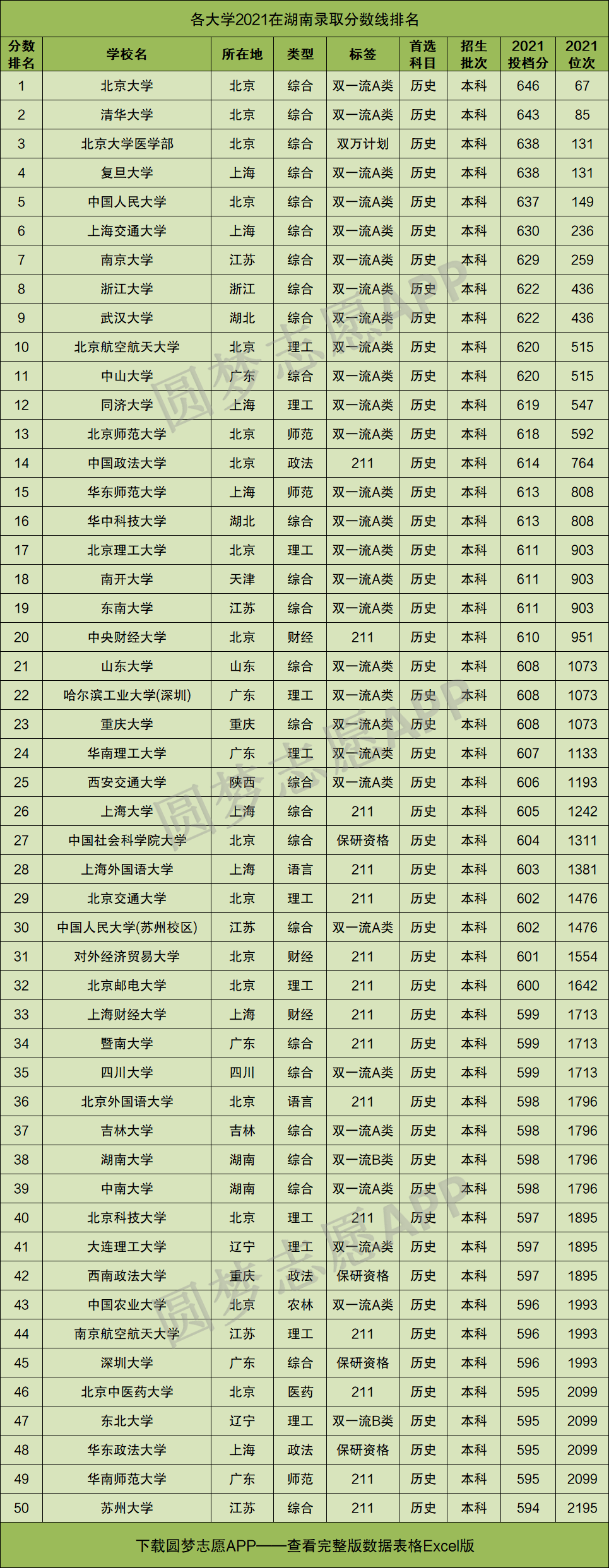 一、2021年高考各大学在湖南录取分数线排名