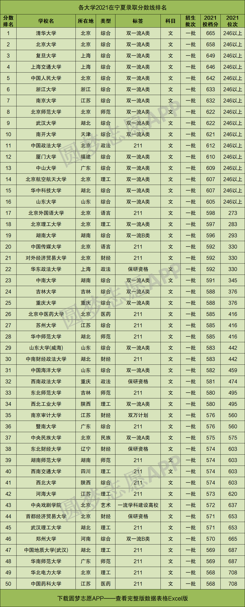小编按照各大学2021年在宁夏文科考生中的投档分数线的高低排序,为大家整理了在宁夏收分最高的前50所大学排名及分数线。