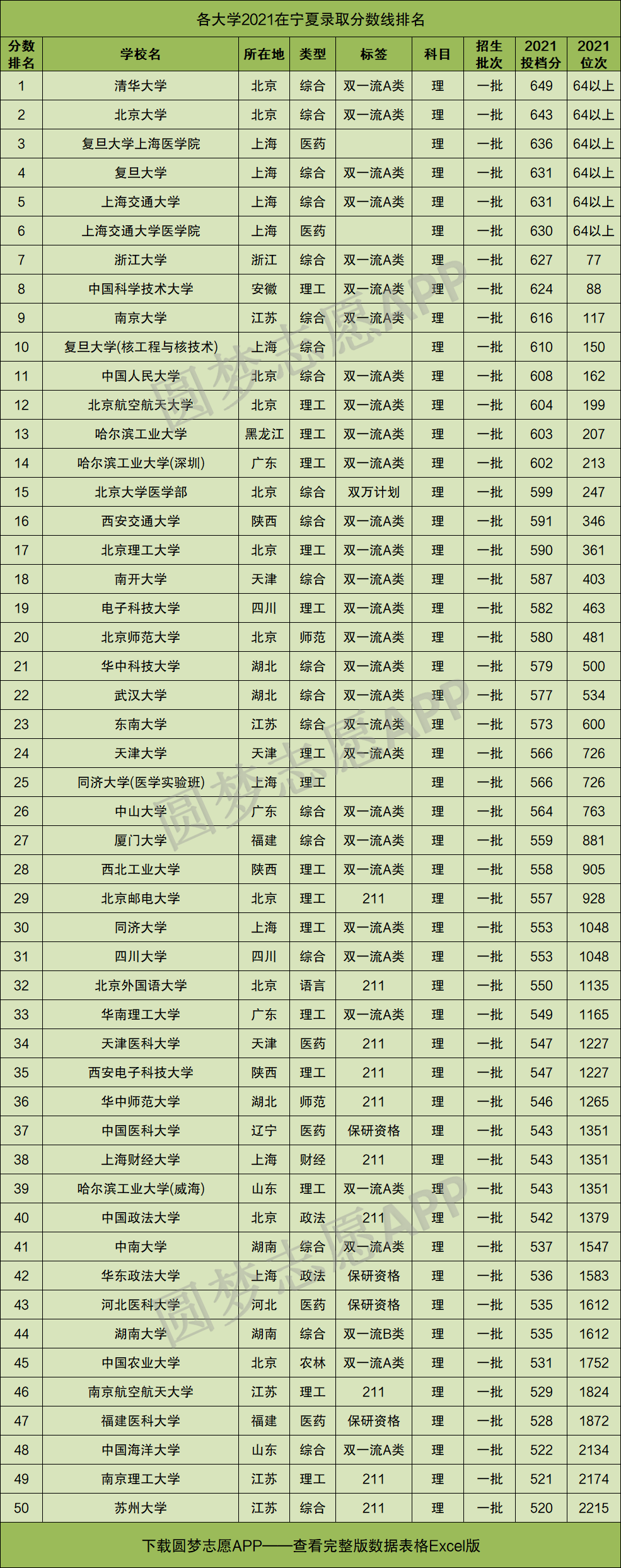 其中,清华大学的录取分数线最高!宁夏理科的考生中,只有成绩在649分以上、位次在64名以内的同学才有机会被录取!