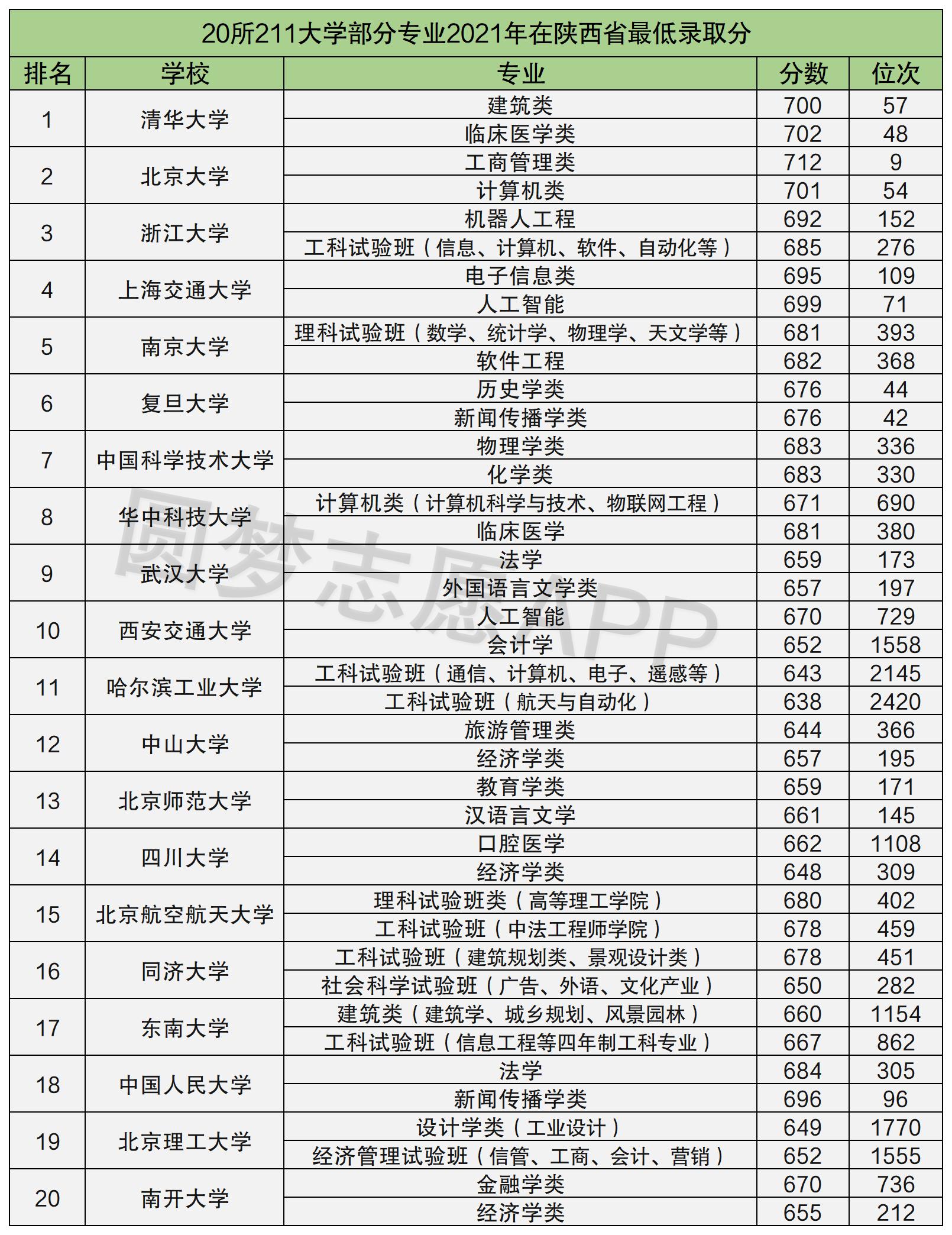 大学在不同省份的录取分数线有所不同,不同专业的分数线也会存在差异,且学校专业数量庞大,这里小编只整理了软科排名前20的211大学部分专业2021年在陕西的录取分数线,供大家参考;其他学校、专业分数线大家可以登录查看。
