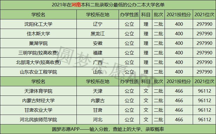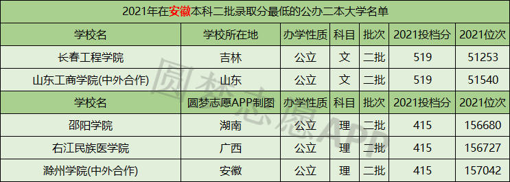 下面是2021年在安徽省本科二批录取分数线最低的公办大学录取分数线及位次一览表: