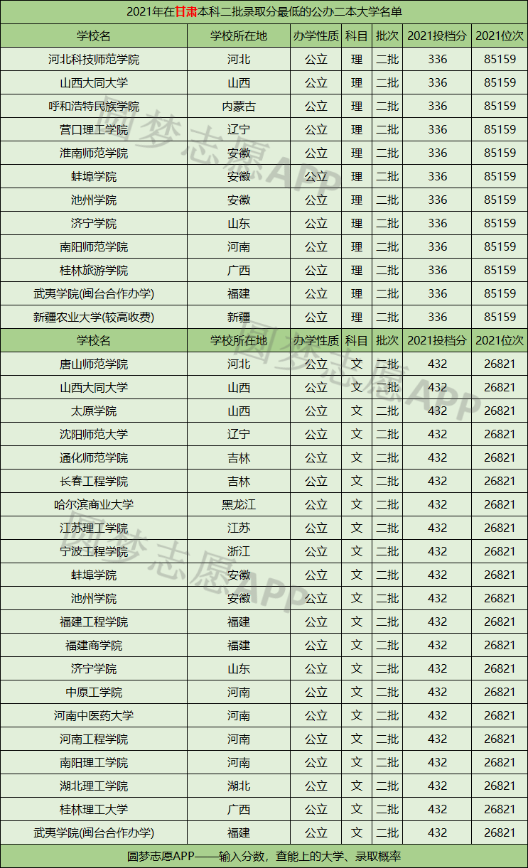 下面是2021年在甘肃省本科二批录取分数线最低的公办大学录取分数线及位次一览表: