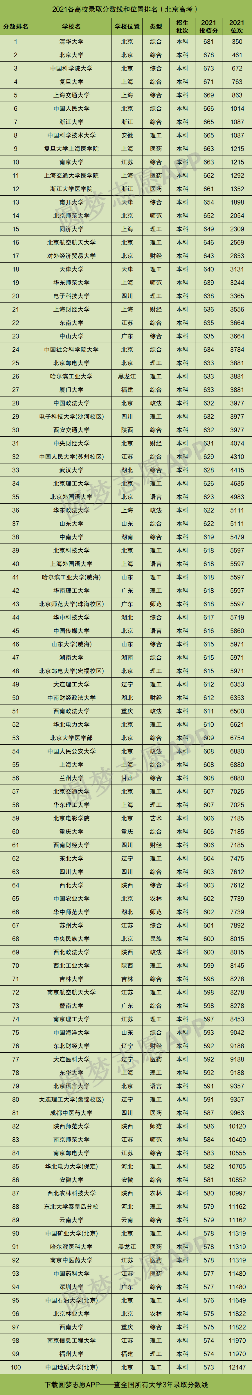 小编按照分数线的高低排序,为大家整理了2021年北京高考录取分数线最高的前一百强大学排名,并为大家附上学校的所在位置。