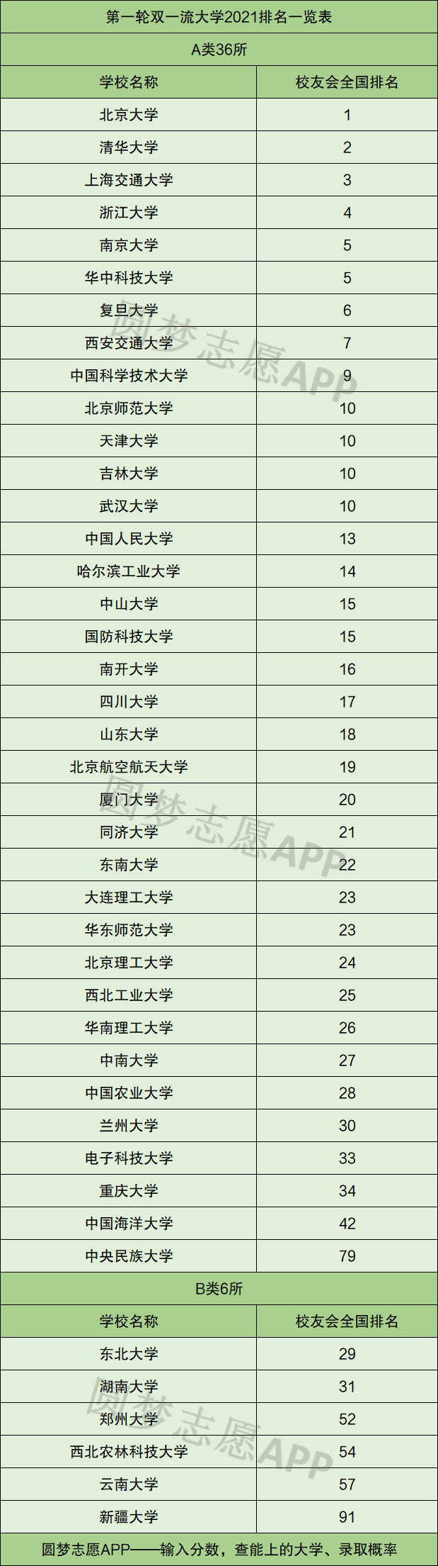 由于第二轮双一流大学名单暂未公布,因此目前仍然以教育部2017年公示的名单为准,第一轮一共有42所双一流大学,其中A类36所,B类6所,下面是国家双一流大学名单及排名2021一览表,其中: