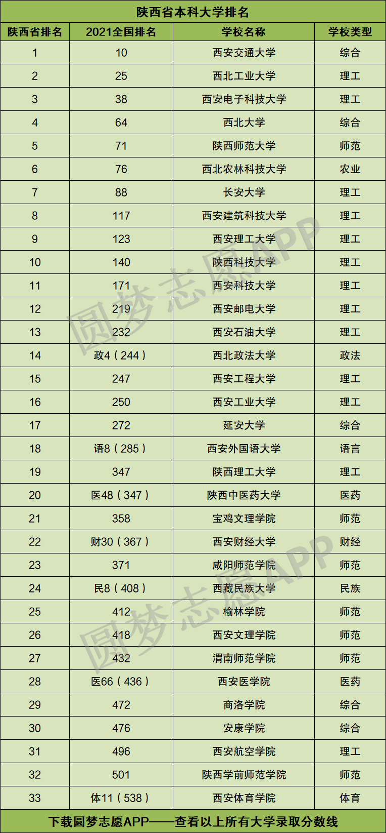 根据软科2021年中国大学前800强排名榜单可知,陕西省内有33所本科大学进入全国大学前800强,这些大学均是陕西省内乃至全国都比较强的大学。具体入选名单及排名如下图: