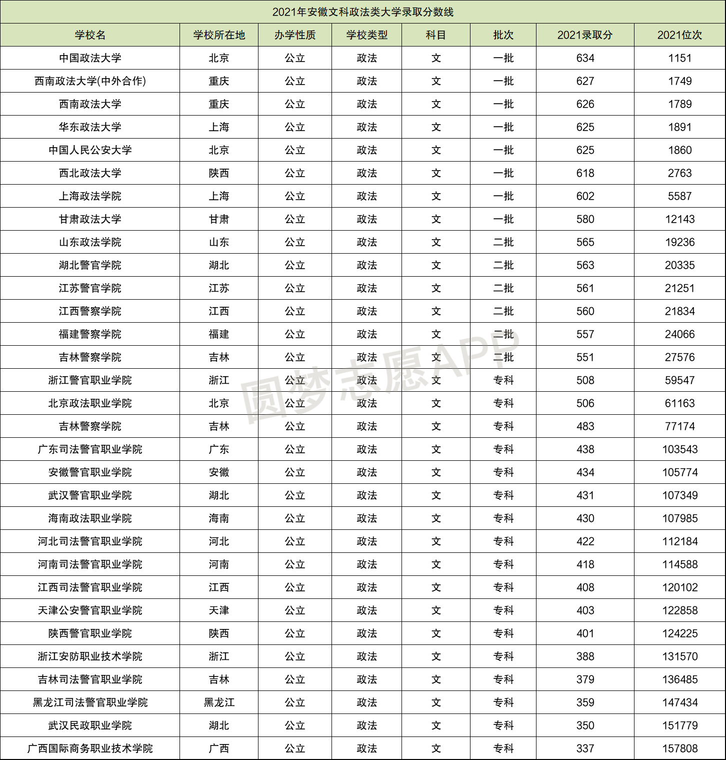 在安徽文科本科二批招生的政法类院校一共有6所,在专科招生的政法类院校有17所,同样全是公办院校,本科二批中收分最高的是山东政法学院,2021年的录取线为565分;专科批中收分最高的是浙江警官职业学院,2021年的录取线为508分。