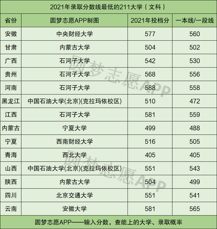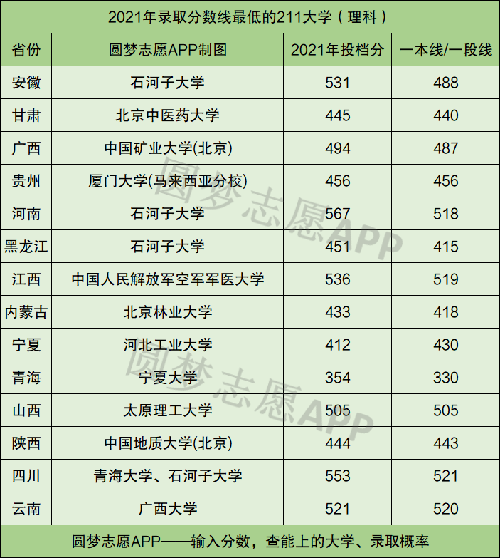 根据各省教育考试院公布的数据,下面为大家整理了2021年在各省本科一批录取分数线最低的211大学汇总。
