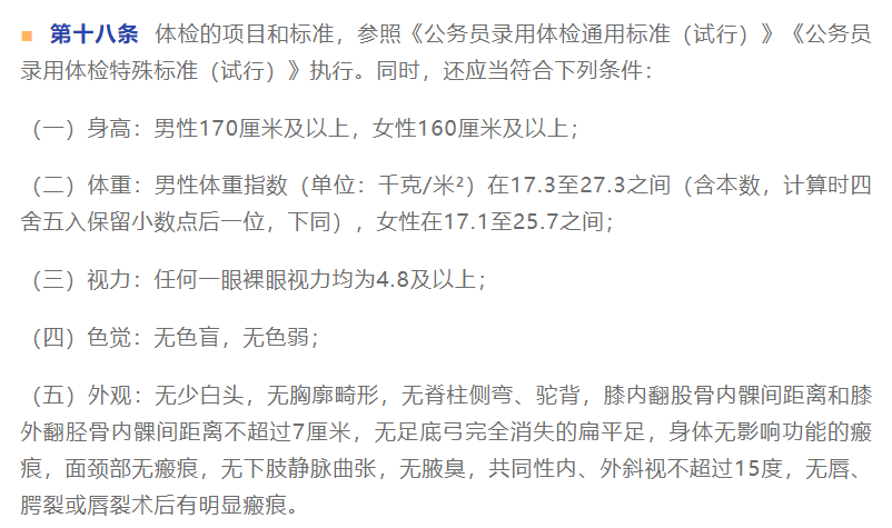 一般来说,警校都要求女生身高160cm以上;视力要求任何一只眼睛裸视4.8以上。同时要求考生无重大疾病、无色弱、色盲等。