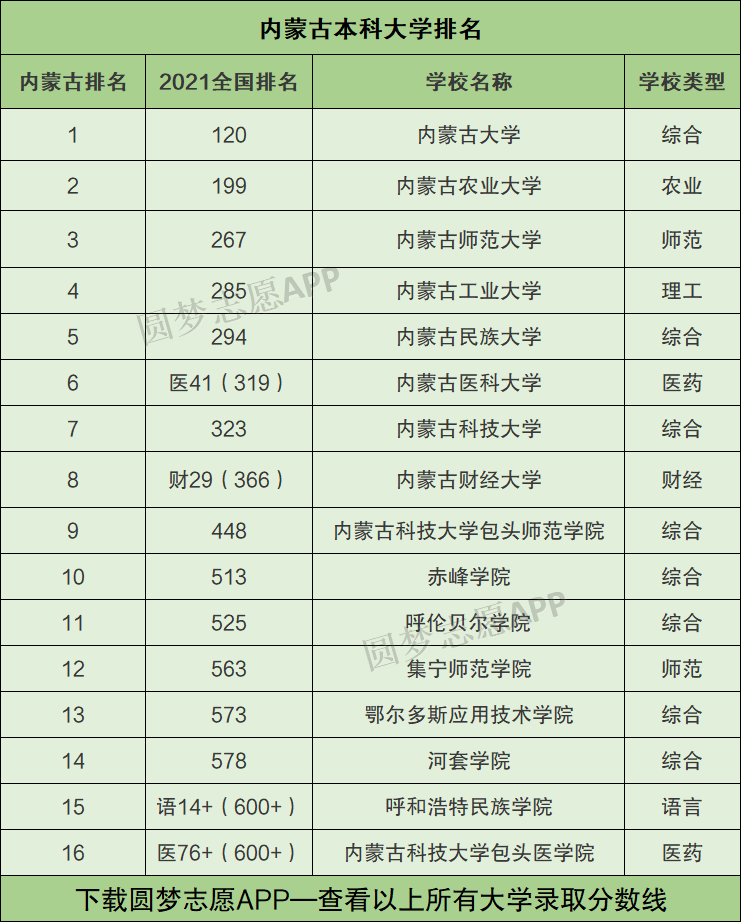 根据软科2021年中国大学前800强排名榜单可知,内蒙古有16所本科大学进入全国大学前800强,这些大学均是内蒙古乃至全国都比较强的大学。具体入选名单及排名如下图: