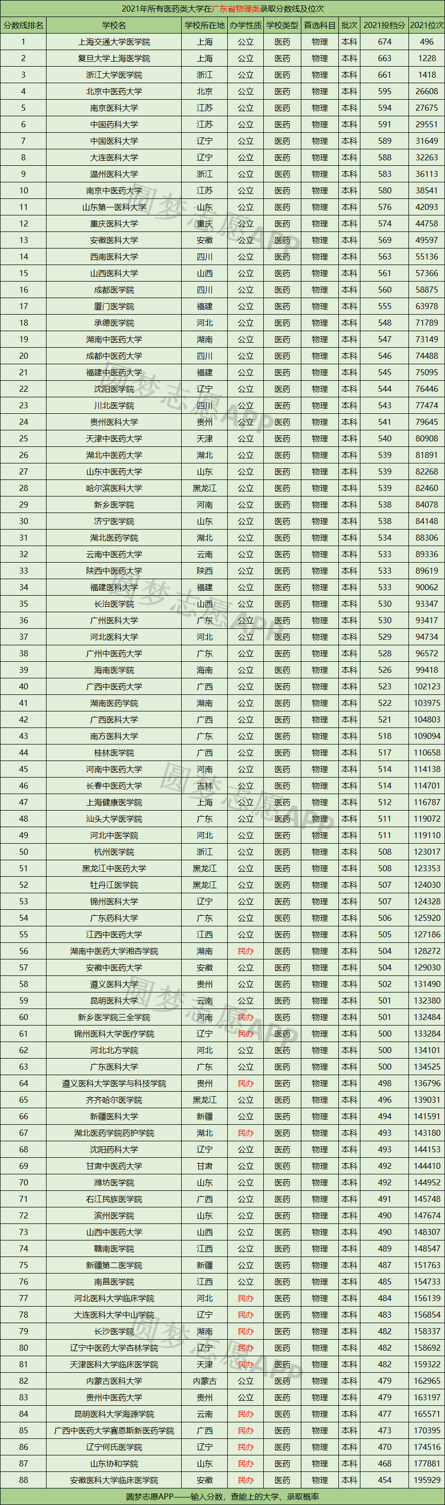 注:广东省2021年实行的是新高考“3+1+2”模式,不分文理科,招生按照首选历史和首选物理划分,想了解四川、河南、广西、陕西等普通高考省份或者是其他综合改革省份医药类大学录取分数线的考生,可。