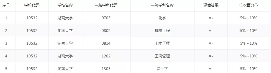 在全国第四轮学科评估中,湖南大学有5个一级学科被教育部评为A类,学科整体排名位于全国前10%。