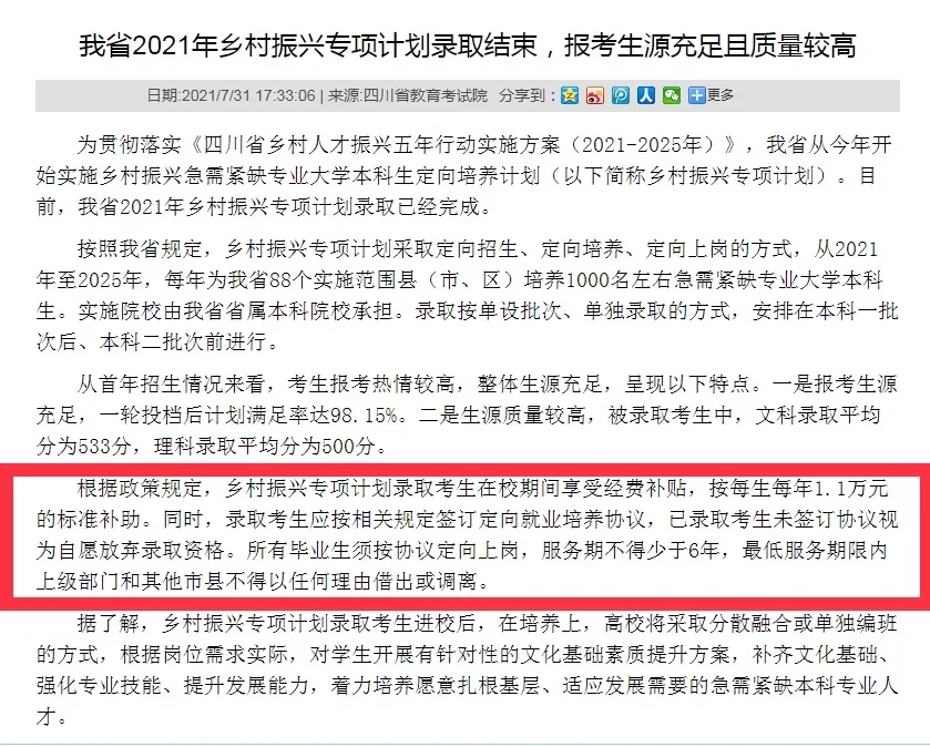 根据政策规定,乡村振兴专项计划录取考生在校期间享受经费补,按每生每年1.1万元的标准补贴,同时录取考生必须按照相关规定签订定向就业培养协议,已录取考生未签订协议则视为自愿放弃录取资格。所有毕业生必须按照协议定向上岗,服务期不得少于6年,最低服务期限为上级部门和其他市县不得以任何理由借出或调离。