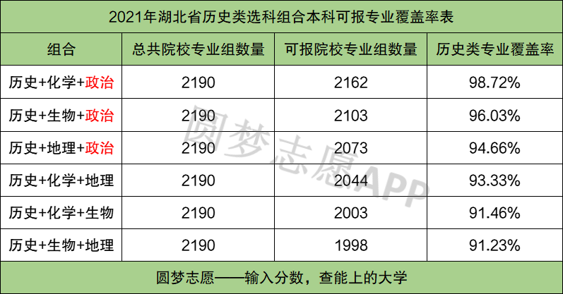 下面是老师根据湖北省教育考试院公布的2021年湖北省招录数据整理的首选历史类中6种选科组合的可报专业覆盖率: