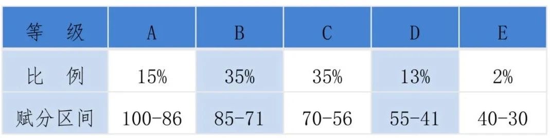根据以上分数计算出来后,将等级成绩按照四舍五入的取整规则确定考生的最终成绩,各等级的比例及赋分区间如下表所示: